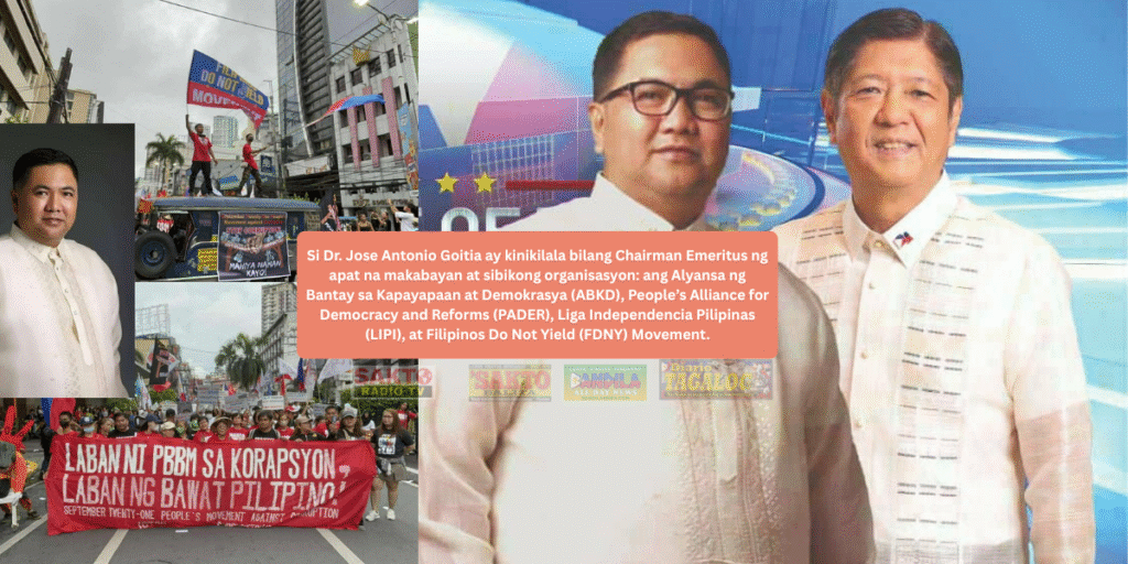 Si Dr. Jose Antonio Goitia ay kinikilala bilang Chairman Emeritus ng apat na makabayan at sibikong organisasyon: ang Alyansa ng Bantay sa Kapayapaan at Demokrasya (ABKD), People’s Alliance for Democracy and Reforms (PADER), Liga Independencia Pilipinas (LIPI), at Filipinos Do Not Yield (FDNY) Movement.(( MARISA SON ))