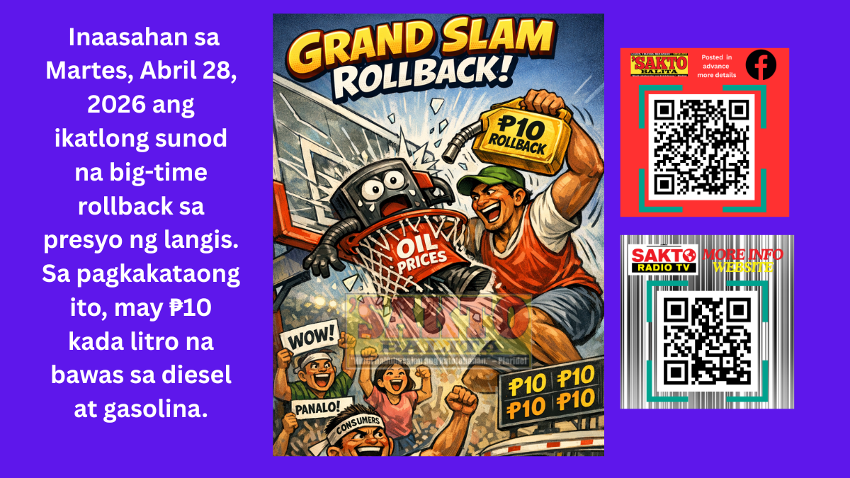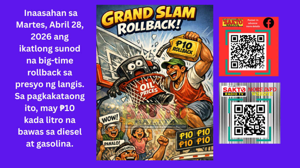 Inaasahan sa Martes, Abril 28, 2026 ang ikatlong sunod na big-time rollback sa presyo ng langis. Sa pagkakataong ito, may ₱10 kada litro na bawas sa diesel at gasolina.
